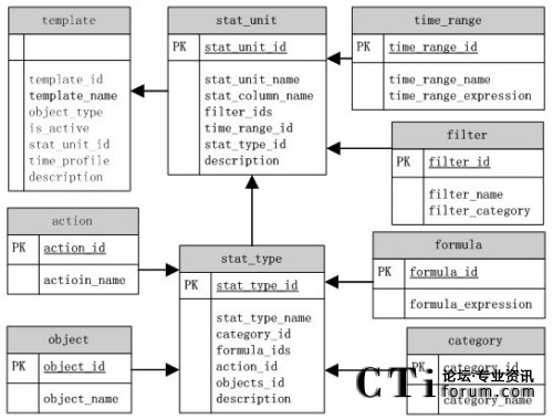 在模板配置存儲模型圖中,分別建立了單獨的表對模板劃分的每一個基本對象進行儲存。表template存儲模板的配置信息,stat_unit表存儲了統(tǒng)計項的基本信息,stat_type表是一些有關(guān)模板具體內(nèi)容的配置。各表之間通過各自的ID標識號來進行關(guān)聯(lián)。不過一個模板可以包括多個統(tǒng)計單元,一個統(tǒng)計項可以包含多個過濾項,一個統(tǒng)計內(nèi)容可以包含多個公式,這樣他們之間的ID關(guān)聯(lián)就成為1對多的關(guān)系。在這種情況下,父項中的ID關(guān)聯(lián)多個子項ID,其間是用逗號分隔。