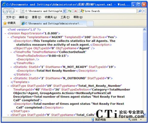 在模板導出的XML儲存圖中,ReportVersion屬性為報表系統(tǒng)的版本號。Template信息用來指定一個模板名字,給模板一個唯一的模板ID,再指定該模板是否激活,另外也為該模板添加了注釋。該例中是對所有坐席活動的數(shù)據(jù)進行統(tǒng)計。ObjectType為模板的統(tǒng)計類型,該模板中統(tǒng)計類型為坐席(Agent)。TimeProfile為設(shè)定收集的時間間隔,本例中為從每天的0點0分開始,每隔15分鐘收集一次。Statistic對應(yīng)了一個統(tǒng)計內(nèi)容配置,根據(jù)StatTypeID在下面將列出詳細內(nèi)容。本例中StatTypeID為19,下面的StatType中將會根據(jù)StatTypeID與之相對應(yīng),其中配置了Category,