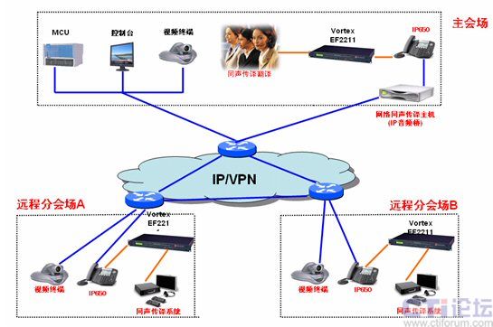 當(dāng)視頻會(huì)議召開時(shí),主會(huì)場(chǎng)的翻譯既通過同聲傳譯系統(tǒng)把翻譯好的內(nèi)容傳輸?shù)奖镜氐呐c會(huì)者,也通過IP音頻會(huì)議系統(tǒng)把翻譯好的內(nèi)容傳輸?shù)竭h(yuǎn)端的會(huì)場(chǎng),遠(yuǎn)端會(huì)場(chǎng)把音頻系統(tǒng)傳輸過來的聲音經(jīng)過EF2211聲音處理系統(tǒng)處理后傳輸?shù)酵晜髯g系統(tǒng),同聲傳譯系統(tǒng)把聲音經(jīng)無線耳機(jī)傳送給需要的與會(huì)者。這樣遠(yuǎn)端會(huì)場(chǎng)的與會(huì)者既可以聽到主會(huì)場(chǎng)的原聲,也可以聽到翻譯好的內(nèi)容。相反,當(dāng)分會(huì)場(chǎng)發(fā)言時(shí)分會(huì)場(chǎng)也可以把本會(huì)場(chǎng)的原聲和翻譯好的內(nèi)容傳輸?shù)街鲿?huì)場(chǎng)。這樣就可以實(shí)現(xiàn)遠(yuǎn)程同聲傳譯。能同時(shí)滿足與會(huì)的所有人員的翻譯需求,既做到翻譯內(nèi)容的統(tǒng)一,又節(jié)省了翻譯人員的人力成本。