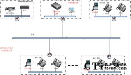 通過網(wǎng)絡(luò)還可以將系統(tǒng)與現(xiàn)有高清視頻會議系統(tǒng)進行連接,在VVX1500話機之間實現(xiàn)單點視頻通信的基礎(chǔ)上,實現(xiàn)VVX1500的多點通訊以及和視頻會議終端之間的點對點視頻通信。同時,領(lǐng)導也可以通過MCU加入到視頻會議中實現(xiàn)多方視頻會議,這樣就可以實現(xiàn)領(lǐng)導在辦公室參加視頻會議,而不用每次去會議室開會。