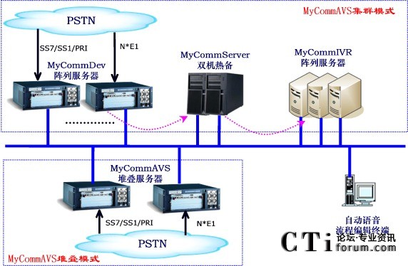 MyCOmmAVS集群模式:將三大核心模塊分布部署,其中MyCommServer核心模塊為雙機(jī)熱備,而MyCommDEV和MyCommIVR都設(shè)計(jì)為集群陣列方案。其優(yōu)勢(shì)的集中監(jiān)控和管理,DEV服務(wù)器和IVR服務(wù)器任何一個(gè)節(jié)點(diǎn)的故障都不影響其他系統(tǒng)。
