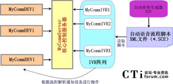 MyCommServer:核心控制服務(wù)器。實(shí)現(xiàn)對(duì)呼叫的控制,和管理DEV設(shè)備控制器和IVR流程解析器等周邊設(shè)備。