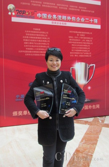在2012中國服務(wù)外包領(lǐng)軍者年會(huì)的頒獎(jiǎng)典禮上,第一線集團(tuán)華北區(qū)總經(jīng)理陳施慧女士上臺(tái)領(lǐng)取了這兩個(gè)獎(jiǎng)項(xiàng)。