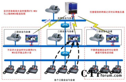 此方案由于使用了簡單而廉價(jià)的CTS軟件MCU,讓3級會議與會者接入CTS MCU,然后由CTS MCU再與上級總的MCU做級連,從而省去了在原來總部MCU端增加與會者數(shù)量許可的價(jià)格。