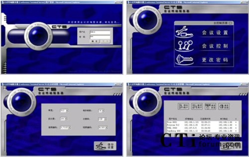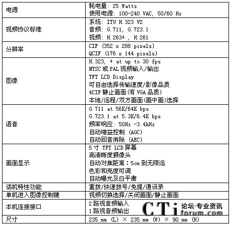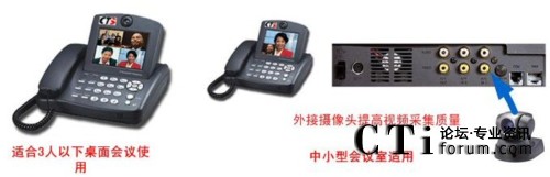 方案中采用的終端為CTS的可視電話終端,該可視電話適合于1-3人的桌面會議,自帶5寸的屏幕,不用額外連接電視機(jī),特別適合于縣級鄉(xiāng)級等底等級的機(jī)構(gòu)使用。同時(shí)可視電話可以外接入清晰的攝像頭,滿足5-10人小會場對于視頻的清晰度要求。