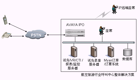 本方案采用AVAYA IP OFFICE系列交換機,通過訊鳥中間件控制整個呼叫中心的電話呼入、呼出。它支持多種聯(lián)絡(luò)渠道,包括語音、交互式自動語音應(yīng)答(IVR)、傳真、電子郵件、web、短消息等,同時利用Myair航空管理系統(tǒng)來完成整個業(yè)務(wù)流程。