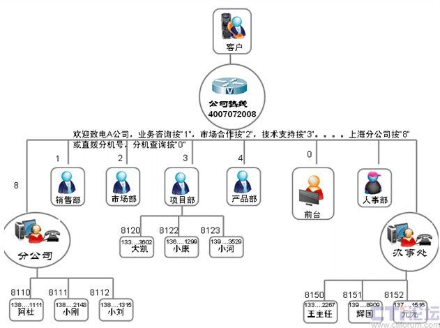 一直以來,呼叫中心座席的形式比較固定,大都通過長期坐在辦公室的人員使用PC機(jī)和電話機(jī)結(jié)合的方式進(jìn)行工作。但是,這種形式顯然不能滿足中小企業(yè)運(yùn)營管理的需要,在以銷售為重的中小企業(yè)中大部分人員并不完全坐在辦公室工作,如客戶經(jīng)理、客戶服務(wù)工程師,即使坐在辦公室,也不會(huì)一直在等著接電話,如開發(fā)工程師、生產(chǎn)車間的人員等等。如何既要滿足企業(yè)運(yùn)營的需要,又要實(shí)現(xiàn)呼叫的管理和分配呢?我們只需要將座席的形式簡化,將呼叫分配的目標(biāo)擴(kuò)大就可以了。手機(jī)是目前最常見和普遍的通信工具,只要我們將手機(jī)做為座席進(jìn)行管理,既不改變現(xiàn)有的組織架構(gòu),又能充分利用呼叫分配工作并對工作人員進(jìn)行管理,這將大大提高中小企業(yè)運(yùn)營管理的靈活性和變通性。企業(yè)組織架構(gòu)如下: