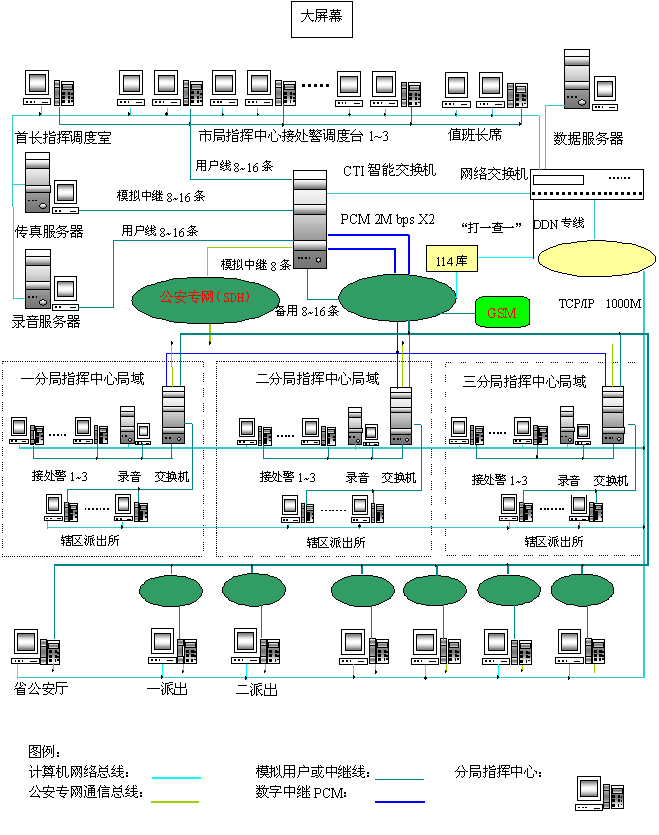- 樹立大網(wǎng)絡(luò)概念:采用先進(jìn)的通訊、計算機(jī)網(wǎng)絡(luò)技術(shù)(采用CTI可編程交換技術(shù)),利用現(xiàn)有的通信資源,實(shí)現(xiàn)市局指揮中心與消防大隊、交警大隊、各派出所的計算機(jī)網(wǎng)絡(luò)及相關(guān)領(lǐng)導(dǎo)辦公室計算機(jī)大聯(lián)網(wǎng);形成全市范圍內(nèi)110、119、122有線、無線全方位立體調(diào)度語音通道大網(wǎng)。