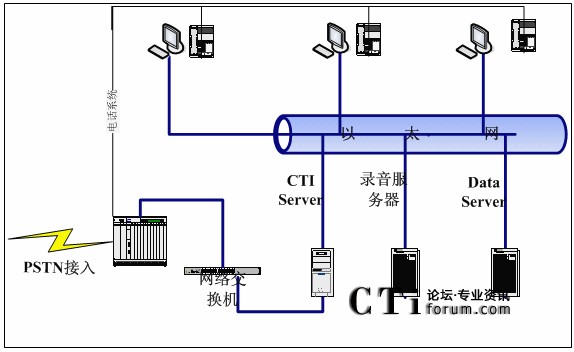 消費者撥打訂購電話,經(jīng)PSTN接入到呼叫中心交換機(jī),由CTI服務(wù)器(CTI Server)通過交換機(jī)將話務(wù)分配到相應(yīng)空閑坐席。坐席端記錄訂購信息及消費者信息,并將信息存入數(shù)據(jù)服務(wù)器(DataServer)。交換機(jī)對通話進(jìn)行全程錄音,并存入錄音服務(wù)器。同時可把進(jìn)入系統(tǒng),但未排隊到坐席的話務(wù)數(shù)據(jù)記錄存入數(shù)據(jù)庫服務(wù)器,以便回訪。