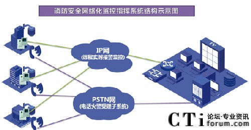 消防網(wǎng)絡傳輸設備通過以太網(wǎng)(TCP),電話線(PSTN),無線(GPRS、CDMA)將火災報警主機接收到的火警及運行信息上傳的鋼廠消防安全監(jiān)控指揮中心。