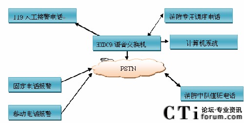 通過CTI服務器軟件配合HXD09語音交換機實現(xiàn)火警電話的呼入排隊,即當電話同時打入 的報警電話超過3個,則系統(tǒng)自動將超過電話進等;當有內線空閑時,受理報警電話;鹁娫捄羧霑r提示聲、光顯示信號。