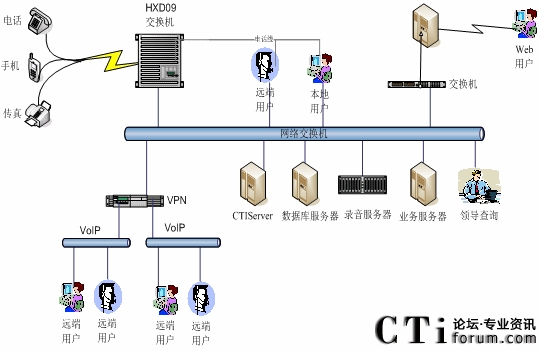 本系統(tǒng)物理結(jié)構(gòu)由交換機、CTI服務(wù)器、IVR(交互式語音應(yīng)答、服務(wù)器、業(yè)務(wù)代表座席(邏輯上分為:普通業(yè)務(wù)代表座席、專家座席等)、班長座席、統(tǒng)計維護管理工作站、因特網(wǎng)(WEB)服務(wù)器、電子郵件(EMAIL)服務(wù)器、數(shù)據(jù)庫/應(yīng)用服務(wù)器、錄音留言工作站、領(lǐng)導查詢工作站、業(yè)務(wù)網(wǎng)關(guān)服務(wù)器、通信網(wǎng)關(guān)、網(wǎng)絡(luò)系統(tǒng)等構(gòu)成。