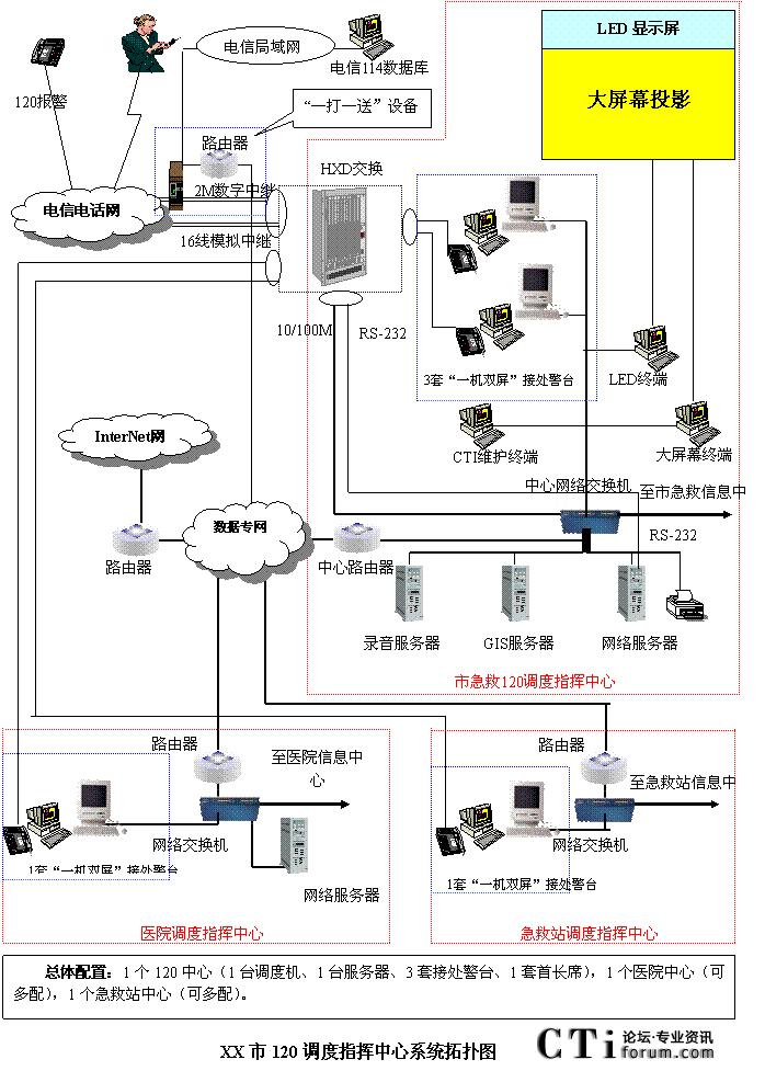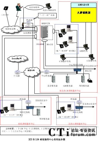 - 樹(shù)立大網(wǎng)絡(luò)概念:采用先進(jìn)的通訊、計(jì)算機(jī)網(wǎng)絡(luò)技術(shù)(如CTI技術(shù)),利用現(xiàn)有的通信資源,實(shí)現(xiàn)市人民醫(yī)院120指揮中心與急救分站的計(jì)算機(jī)網(wǎng)絡(luò)及相關(guān)領(lǐng)導(dǎo)辦公室計(jì)算機(jī)大聯(lián)網(wǎng);形成全市范圍內(nèi)120有線、無(wú)線全方位立體調(diào)度語(yǔ)音通道大網(wǎng);為今后督查聯(lián)網(wǎng)、大聯(lián)動(dòng)打下基礎(chǔ)。