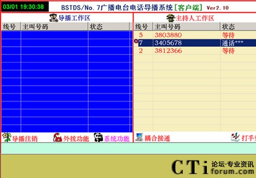 其狀態(tài)都是處于等待狀態(tài),此時3個嘉賓都處在旁聽直播室的狀態(tài)當(dāng)中。如果接聽某參與者的電話,主持人就使用操作鍵盤的[控制]鍵后,用[選擇]鍵選中要接聽的電話,然后按[通話]鍵,即可同參與者進(jìn)行通話。通話線路的狀態(tài)顯示為“通話***”,如下圖所示: