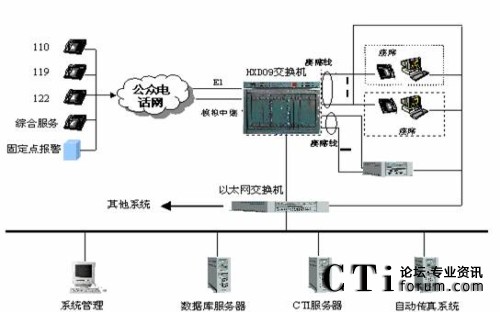 綜合接警平臺(tái)主要由hxd09可編程智能語(yǔ)音交換機(jī)和計(jì)算機(jī)網(wǎng)絡(luò)兩部分組成,交換機(jī)負(fù)責(zé)110、119、122報(bào)警電話(huà)的接入與分流及調(diào)度呼出等功能;計(jì)算機(jī)網(wǎng)絡(luò)則完成110、119、122報(bào)警信息的顯示、數(shù)據(jù)儲(chǔ)存、統(tǒng)計(jì)及信息查詢(xún)、發(fā)布功能。