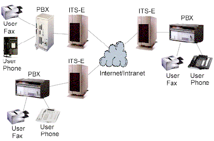 許多公司有多個(gè)辦公地點(diǎn),各地之間有著頻繁的通訊往來(lái),電話和傳真。典型地,通訊涉及到公用交換電話網(wǎng)(PSTN)或PBX間的私人連接路線。Internet電話服務(wù)器(ITS-E)提供了另一選擇。基本原理是一處用戶撥打的電話經(jīng)本地PBX路由到本地ITS-E,本地ITS-E通過(guò)IP網(wǎng)絡(luò)送到目的地ITS-E,目的地ITS-E再將電話送到目的地PBX上,最后送到目的地電話或傳真機(jī)上。