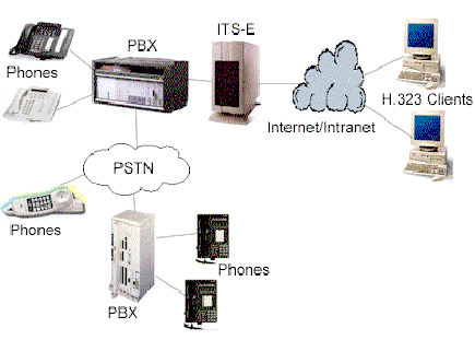 計(jì)算機(jī)IP電話產(chǎn)品,類(lèi)似網(wǎng)絡(luò)會(huì)議系統(tǒng),允許用戶使用他們當(dāng)前的IP聯(lián)接把通話接到電腦上去(如通過(guò)以太網(wǎng)聯(lián)接到他們的局域網(wǎng)中)。這種作法的局限是PC用戶只可以與另一PC用戶通話。然而,使用ITS-E,這種局限將不存在。任何在網(wǎng)絡(luò)上的PC可使用H.323(用于IP電話上的ITU-T標(biāo)準(zhǔn))軟件包來(lái)實(shí)現(xiàn)通話,如微軟的網(wǎng)絡(luò)會(huì)議系統(tǒng),通過(guò)ITS-E服務(wù)器通至一個(gè)常規(guī)的電話使用者。電話用戶不需要任何新的裝備,甚至不會(huì)意識(shí)到聲音是從PC機(jī)中傳出及在IP網(wǎng)絡(luò)中傳輸。示意圖如下: