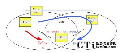 在GRRU安裝過程中會(huì)遇到信源基站和光纖直放站信號(hào)重疊的問題,就是由于多徑傳播引起的時(shí)間色散產(chǎn)生同頻干擾。對(duì)于上圖所示,我們假設(shè)基站到戶用之間的信號(hào)質(zhì)量較好,能夠接收到正常的基站信號(hào),但是此時(shí)如果引入一個(gè)GRRU,此時(shí)的時(shí)延差為delayB-delayA=(5Km的空間時(shí)延+10Km光纜時(shí)延+設(shè)備時(shí)延)-5Km的空間時(shí)延=10Km光纜時(shí)延+設(shè)備時(shí)延=2Km×4.76us/Km+10μs=19.52 us>15μs(4TA)。此時(shí)直放站的信號(hào)就只能判斷為同頻干擾信號(hào),必須小于同頻干擾保護(hù)比9dB。