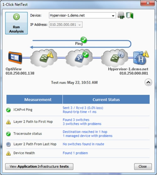 OptiView XG v8 具備兩種新的故障排除功能:一鍵 NetTest 和自動多段分析,能夠迅速確定數(shù)據(jù)路徑以及隔離出物理和虛擬網(wǎng)絡(luò)中的問題。只需按一下按鍵,一鍵 NetTest 就能找出單個(gè)屏幕視圖里的連接路徑。