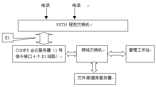 系統(tǒng)主要由網(wǎng)絡(luò)、數(shù)據(jù)庫(kù)服務(wù)器(DBS)、會(huì)議服務(wù)器(CONFS)、管理工作站幾個(gè)部分組成。數(shù)據(jù)庫(kù)服務(wù)器主要負(fù)責(zé)數(shù)據(jù)的存儲(chǔ),而CONFS完成電話話路的接入與會(huì)議控制,彼此之間相輔相承。如圖所示:
