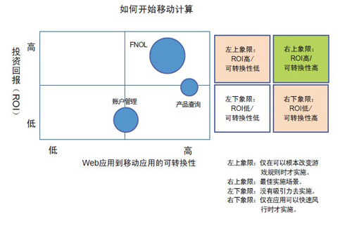 建議考察兩個基本維度:(1)第一個移動項目的總投資回報(ROI)和價值主張是什么?(2)現(xiàn)有的Web應用如何通過相對較少的努力就可以轉變成移動應用?在下面的圖表中這兩個維度被標為X軸和Y軸。氣泡的大小代表投入的大小。很顯然,右上方的象限是容易摘取的果子。您選擇哪個氣泡關鍵在于您對風險的偏好以及在市場中成為領先者的渴望。