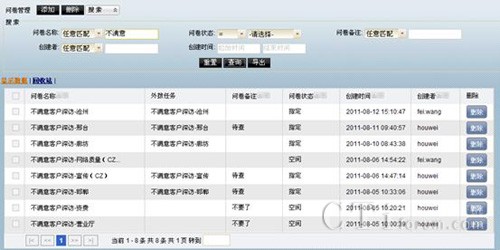 利用搜索功能,輸入搜索條件然后查詢,列表中便會(huì)出現(xiàn)質(zhì)檢的問卷結(jié)果。以及問卷中每一個(gè)問題出現(xiàn)所選擇的答案,供質(zhì)檢人員檢測(cè)、監(jiān)督問卷的真實(shí)可靠性。