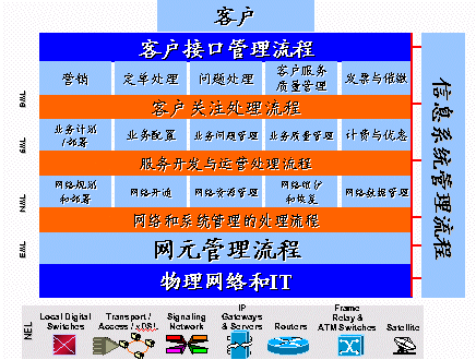 Assurance)的定義是,提供量化的測量指標(biāo),確保網(wǎng)絡(luò)服務(wù)能夠達(dá)到客戶所訂購的要求。(Service Usage)的定義是,測量電信網(wǎng)絡(luò)中各種業(yè)務(wù)的使用情況,計(jì)算處理使用電信業(yè)務(wù)的應(yīng)收費(fèi)用,并對電信業(yè)務(wù)的收費(fèi)過程提供支持。這是從縱向的角度來看,而從橫向的角度來看,從電信管理的角度來看,OSS主要處在三個(gè)管理層面:客戶服務(wù)層;業(yè)務(wù)管理層;網(wǎng)絡(luò)管理層。