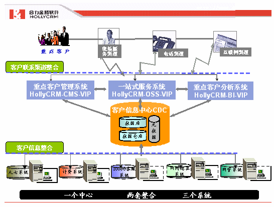 ·三個系統(tǒng):即重點客戶管理子系統(tǒng)(HollyCRM-CMS-VIP);重點客戶分析子系統(tǒng)(HollyCRM-BI-VIP);一站式服務子系統(tǒng)(HollyCRM-OSS-VIP)。