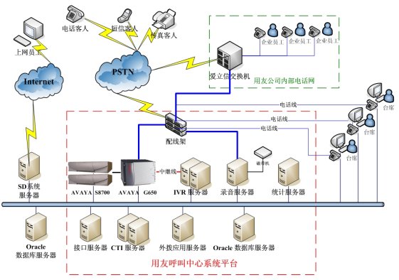 - 完善的業(yè)務(wù)系統(tǒng)整合能力:通過與用友的后臺SD業(yè)務(wù)系統(tǒng)的集成,實現(xiàn)了接入系統(tǒng)與后臺業(yè)務(wù)系統(tǒng)的數(shù)據(jù)共享,使得前臺呼叫中心接入與后臺SD業(yè)務(wù)系統(tǒng)數(shù)據(jù)處理,形成了客戶、服務(wù)單、錄音等數(shù)據(jù)的關(guān)聯(lián),組成了完整的信息流轉(zhuǎn)體系,從而保障用友客戶服務(wù)中心客戶信息的高度的一致性和高效性;