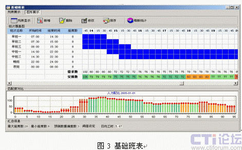 引入呼叫中心排班系統(tǒng)是提升坐席資源利用率的有效解決方案,排班系統(tǒng)可以對大量的歷史呼叫數(shù)據(jù)進行分析,并剔除特殊事件對呼叫量的影響,從而得出呼叫量變化的規(guī)律曲線,再輔助對特殊預(yù)期事件影響度的疊加,可以對未來一定時間的呼叫量變化做出比較客觀的預(yù)測(圖2)。在預(yù)測話務(wù)量變化曲線的同時,結(jié)合人員技能和班次設(shè)定,給出高擬合度的人工排班方案(圖3)。更為重要的是,成熟排班系統(tǒng)提供的話務(wù)預(yù)測模型多具備學習能力,能夠?qū)㈩A(yù)測的話務(wù)數(shù)據(jù)與實際話務(wù)數(shù)據(jù)進行對比,從而不斷提高話務(wù)預(yù)測模型的預(yù)測精度。成熟排班工具可以在保持呼叫中心同等服務(wù)水平的前提下,降低人工坐席代表的投入數(shù)量,進而釋放部分人工資源開展其它業(yè)務(wù)。