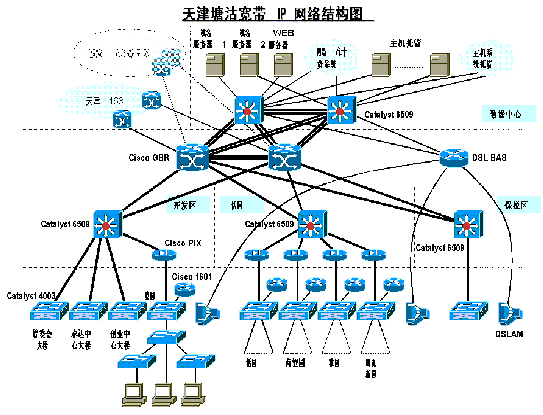 除以上三層之外,在塘沽電信局將建立一個數(shù)據(jù)中心,由兩臺Cisco Catalyst6509第三層交換機為數(shù)據(jù)中心提供數(shù)據(jù)交換及路由。接入的DSLAM設備,小區(qū)內的樓層交換機及用戶前端設備(CPE)也屬于接入層。接入層主要為最終用戶提供多種寬帶接入方式。