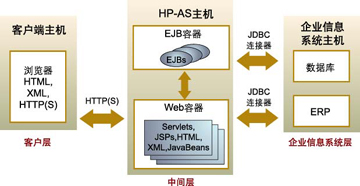 在一個(gè)開發(fā)環(huán)境中把上述3層一般都安裝在同一臺(tái)計(jì)算機(jī)上,以便模擬3層環(huán)境。這樣,開發(fā)者在實(shí)際環(huán)境開發(fā)應(yīng)用之前,可以快速開發(fā)和測試應(yīng)用?墒,在實(shí)際環(huán)境中,各個(gè)層一般位于不同的計(jì)算機(jī)上。圖2表示了HP-AS是如何采用J2EE技術(shù)實(shí)現(xiàn)分布式應(yīng)用的。