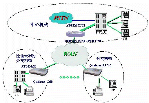 。。如圖是一個典型的企業(yè)網(wǎng)IP電話組網(wǎng)方案,在總部采用Quidway®R3640E/3680E路由器作為中心語音網(wǎng)關(guān)設(shè)備,在E1線路上實現(xiàn)VoIP功能;如果機構(gòu)規(guī)模不是很大,也可以采用AT0/E&M連接PBX;在各分支機構(gòu)及網(wǎng)點,則可采用Quidway®