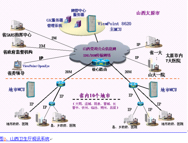 8000綜合視訊系統(tǒng),主會(huì)場(chǎng)設(shè)在非典防治指揮中心,利用現(xiàn)有的山西黨政公眾信息網(wǎng)絡(luò)及通信部門緊急支援的2Mbps數(shù)據(jù)專線,整個(gè)系統(tǒng)采用H.323協(xié)議,在省內(nèi)7大醫(yī)院、及省政府有關(guān)部門使用ViewPoint