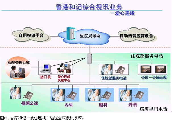 目前,香港和記電信已經(jīng)在香港的"瑪麗醫(yī)院"大廳、非典病房、以及其他安全場(chǎng)所安裝了個(gè)人視頻系統(tǒng),通過(guò)該系統(tǒng),病人和家屬就可以進(jìn)行"面對(duì)面"的交流,無(wú)論對(duì)于非典病人的康復(fù),還是保護(hù)病人家屬,防止非典傳染都有及其重要的作用。