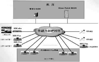 在公司總部安裝一套寬帶視訊交換平臺ViewPoint 8620及管理系統(tǒng),在公司總部建設(shè)一個(gè)大型視訊會(huì)議室作為主會(huì)場,視訊終端采用ViewPoint 8030mBox。北京另外兩個(gè)小會(huì)議室配置普通視訊終端ViewPoint 8020plus,外地30個(gè)辦事處會(huì)議室各配置一臺ViewPoint 8020plus視訊終端。2套ViewPoint OpenEye視訊終端安裝于領(lǐng)導(dǎo)桌面,可以用于接入會(huì)議、召集會(huì)議,或者內(nèi)部IP話等。本系統(tǒng)總共包括一臺ViewPoint8620視訊交換平臺,一臺ViewPoint 8030mBox視訊終端和32臺ViewPoint 8020plus視訊終端,兩套領(lǐng)導(dǎo)用桌面終端ViewPointOpenEye。