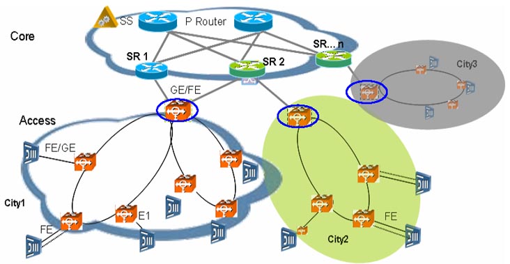 PoPs)可以采用MSTP設備上的以太二層交換功能把所有業(yè)務匯聚到GE并與SR/PE設備之間互通。因為在Aggregation