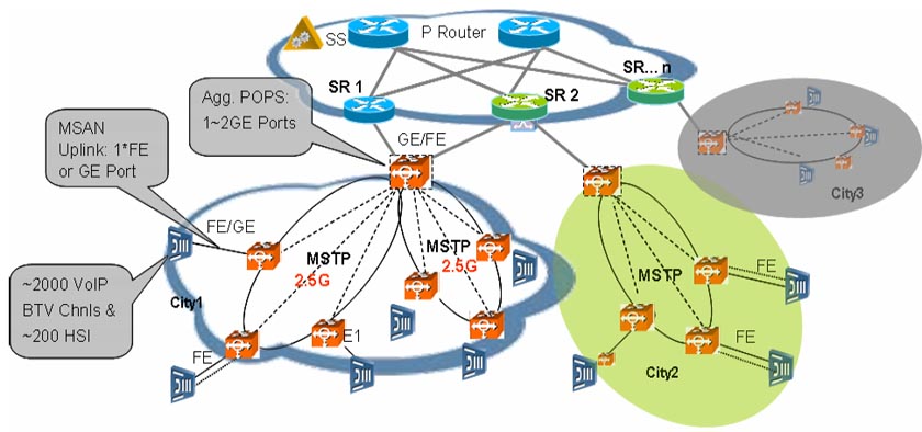 MSAN已經(jīng)逐漸成為基于IP架構(gòu)的下一代電信網(wǎng)建網(wǎng)的主要接入方式,近幾年越來越多的固網(wǎng)運營商普遍采用綜合接入(MSAN)建網(wǎng)模式,如英國的最大固網(wǎng)運營商英國電信的21CN網(wǎng)絡,中國的最大固網(wǎng)運營商中國電信、中國網(wǎng)通,巴西的最大固網(wǎng)運營商Telemar等。而MSTP單一平臺具備支持MSAN接入的所有業(yè)務的承載要求,且成本最低。華為公司MSTP設備具有強大的數(shù)據(jù)接入?yún)R聚及傳送特性,并通過Metro