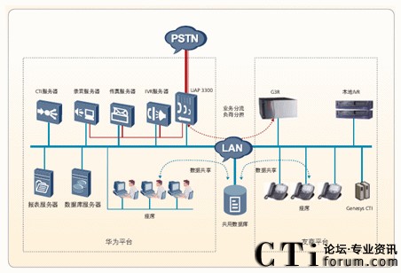 客戶電話通過PSTN統(tǒng)一由華為UAP3300排隊機接入,由華為平臺的IVR服務器進行業(yè)務導航分流,根據(jù)用戶的選擇和IVR流程的配置進行路由,可以選擇不同平臺來處理此業(yè)務。來話根據(jù)IVR流程路由后,兩個平臺采用負荷分擔方式進行工作。在將來話導入兩個平臺后,采用不同設備的IVR進行業(yè)務分配,不同平臺的座席處理不同的業(yè)務。在處理過程中,不同平臺的座席之間可以互轉,達到全網(wǎng)資源共享的功能。