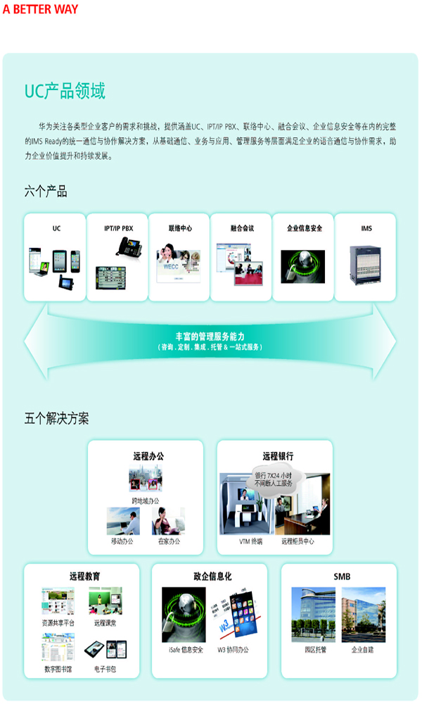 華為企業(yè)業(yè)務是華為三大業(yè)務集團之一。依托華為強大的研發(fā)和綜合技術(shù)能力,我們在企業(yè)業(yè)務領域與合作伙伴開放合作,理解客戶所需,致力于為全球政府及公共事業(yè)、金融、交通、電力、能源、商業(yè)企業(yè)及互聯(lián)網(wǎng)等行業(yè)以及大中小企業(yè)客戶提供全面、高效的ICT解決方案和服務,包括IP基礎網(wǎng)絡、統(tǒng)一通信與協(xié)作、云計算與數(shù)據(jù)中心等。
