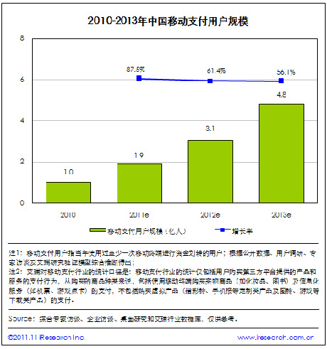 根據(jù)艾瑞咨詢(xún)統(tǒng)計(jì)數(shù)據(jù),2011年中國(guó)移動(dòng)支付用戶(hù)規(guī)模將達(dá)到1.9億。艾瑞預(yù)計(jì),2013年中國(guó)移動(dòng)支付用戶(hù)規(guī)模將達(dá)到4.8億。移動(dòng)網(wǎng)上支付用戶(hù)規(guī)模的增長(zhǎng)帶動(dòng)了整個(gè)行業(yè)用戶(hù)規(guī)模的爆發(fā),另外手機(jī)短信支付也在用戶(hù)群體中得到了進(jìn)一步的普及。