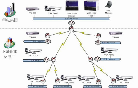 華電集團(tuán)領(lǐng)導(dǎo)十分重視電力信息化及華電集團(tuán)電子政務(wù)的建設(shè)工作。為了貫徹國務(wù)院對政府系統(tǒng)信息化建設(shè)的要求,實(shí)現(xiàn)華電集團(tuán)政務(wù)辦公和行業(yè)管理信息服務(wù)的電子化、網(wǎng)絡(luò)化,滿足華電集團(tuán)建立辦事高效、運(yùn)轉(zhuǎn)協(xié)調(diào)、行為規(guī)范的行政管理體制的要求,加快推進(jìn)電力行業(yè)信息化建設(shè),華電集團(tuán)決定開展華電集團(tuán)信息化建設(shè)二期工程建設(shè),即在現(xiàn)有的基礎(chǔ)上再增加一臺MCU以及在下屬企業(yè)及電廠增加37臺終端。鑒于POLYCOM在視頻會議強(qiáng)大的技術(shù)優(yōu)勢以及神州數(shù)碼在視頻會議系統(tǒng)建設(shè)和實(shí)施上的雄厚實(shí)力和豐富經(jīng)驗(yàn),華電集團(tuán)決定包括MCU和終端的所有設(shè)備都采用POLYCOM的產(chǎn)品。整個系統(tǒng)主要建立在華電集團(tuán)現(xiàn)有的視頻會議的基礎(chǔ)之上,依據(jù)H.323標(biāo)準(zhǔn)協(xié)議建設(shè)視頻會議系統(tǒng)二期組網(wǎng)。其中,控制中心新增一臺POLYCOM公司的MGC+100多點(diǎn)控制單元(即MCU);POLYCOM 高性能的VSX7000E作為下屬企業(yè)及電廠主接點(diǎn)視頻會議終端。