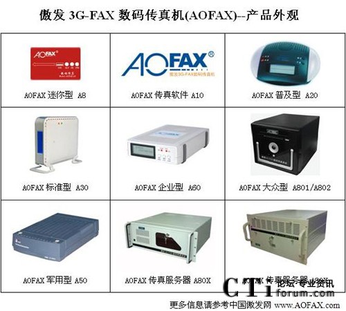 AOFAX系列電腦傳真產(chǎn)品擁有最齊全的型號,包括免費使用的AOFAX傳真軟件A10、SOHO/商旅人士便攜使用的AOFAX迷你型數(shù)碼傳真機A8、單電腦使用的AOFAX普及型數(shù)碼傳真機A20、4用戶環(huán)境的AOFAX標(biāo)準型電子傳真機A30、軍警使用的AOFAX軍用型傳真系統(tǒng)A50、公安專用傳真服務(wù)器A51、營運版網(wǎng)絡(luò)傳真服務(wù)期A52、不限用戶數(shù)目的AOFAX企業(yè)型網(wǎng)絡(luò)傳真機A60、1至2線的AOFAX大眾型傳真服務(wù)器A801和A802,2至256傳真線路多種規(guī)格的AOFAX專業(yè)型傳真服務(wù)器A80X、跨區(qū)域大型公司使用的集團傳真系統(tǒng)和行業(yè)解決方案等,價格從幾百到幾十萬元,可適應(yīng)各類型客戶的需求,以下為AOFAX全系列產(chǎn)品外觀圖。