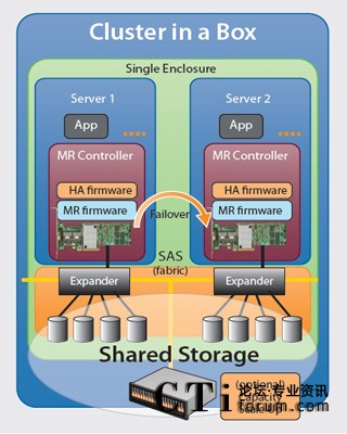 SAS 控制器對(duì)每個(gè)主板實(shí)現(xiàn)集群化,同時(shí)為兩部服務(wù)器提供冗余存儲(chǔ)連接功能。