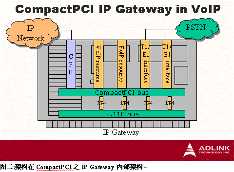 如何實現(xiàn)如此多功能的IP Gateway如圖二架構(gòu),在CompactPCI標(biāo)準(zhǔn)的背板上,整合了計算機(jī)電話領(lǐng)域常用的標(biāo)準(zhǔn)H.110 bus,提供冗余時鐘支持熱插拔板卡如VoIP、FoIP、T1/E1