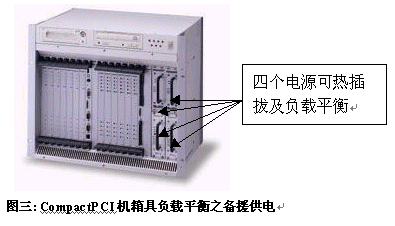如圖三,CompactPCI機(jī)箱備有熱備份電源及風(fēng)扇,電源自動負(fù)載平衡,降低故障發(fā)生率。