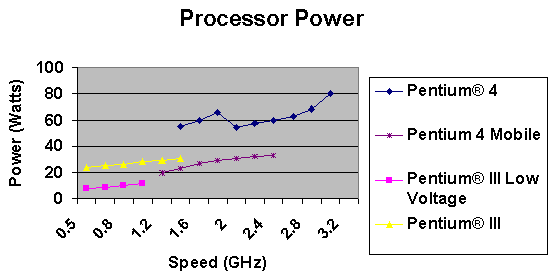 一個32W的功率讓一顆Pentium 4的處理器可以跑到1.7GHz,要增加處理器的速度則讓我們必須增加散熱片的大小,或是降低最大操作溫度、增強(qiáng)吹風(fēng),或者是這些方法中的某種組合。下一代的設(shè)計目標(biāo)會是達(dá)到3GHz的P4處理器,那表示我們必須要能處理65W的熱能。下一代的卡板由于將具備更加多樣豐富的功能與規(guī)格,勢必難以在增加散熱片大小上做文章,多出來的33W將必須通過增加風(fēng)速和降低最大操作溫度來達(dá)成。每分鐘450英尺的風(fēng)速,散熱片熱阻0.45°C/W,周邊操作溫度可被降到40°C。如果給定這樣的條件,處理器最大的功率將是