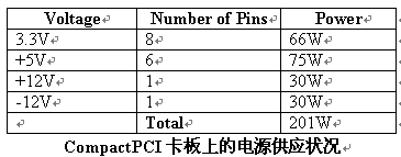 CompactPCI卡板透過J1/J2的連接器來接收電源。有8個3.3V、6個5V、1個+12V、1個-12V的電源接腳。這些接腳供應(yīng)1安培 IEC61076-4-101規(guī)格的電。每個接腳一安培的限制是保守的,而且某種程度上會誤導(dǎo)讓人以為所有的接腳可以在周邊溫度70°C的狀況下去接一安培的電流。在現(xiàn)實狀況中并不是所有連接器中的接腳都負(fù)載到最大的電流量,事實上大部分的CompactPCI接腳都是負(fù)載在以毫安為單位的電流范圍中。70°C一安培的限制,是基于流過接腳的電流所產(chǎn)生的熱。當(dāng)電流增加時,也加大了跨過接腳的電位差。產(chǎn)生的熱是一種電壓和電流的函數(shù),電壓和電流的增加會使連接器接腳的溫度上升。在CompactPCI中有最顯著電流量的的接腳,是電源供應(yīng)器接腳。如果設(shè)計者假設(shè)J1/J2連接器中的其它所有接腳都有電流負(fù)載,每一個接腳的最大電流則會是在40°C 2.5Amps, 這個信息可以在IEC61076-4-101的規(guī)格中的4.2.3中被找到。在每個接腳2.5安培的條件下,板卡可取得的功率大小如下表所示,此表顯示出卡板的設(shè)計者最多可以從J1/J2連接器中拉出200Watts的電。