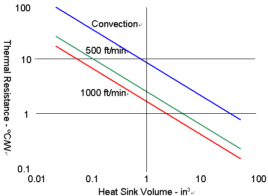 從圖上可以看出散熱片的散熱能力并不和風(fēng)速成一線性函數(shù),在熱阻上一個非常顯著的改善,會在稍呈對流狀態(tài)的空氣與每分鐘500英尺的風(fēng)速情況下顯現(xiàn)出來,但是從每分鐘500英尺增加到每分鐘1000英尺的風(fēng)速時,熱阻的改善就沒那么顯著了。另一個用吹風(fēng)方式的限制因素是噪音,當(dāng)吹過卡板與散熱片的風(fēng)速增加時,所產(chǎn)生的噪音也會增加。從實務(wù)面來看,大部分的CompactPCI機(jī)箱提供每分鐘300英尺的風(fēng)速,如先前提到的,散熱片通常會被內(nèi)存以及PMC的空間給限制了大小,一個CompactPCI卡板若含有兩個PMC的設(shè)計,通常會有一個處理器散熱片的大小約為3