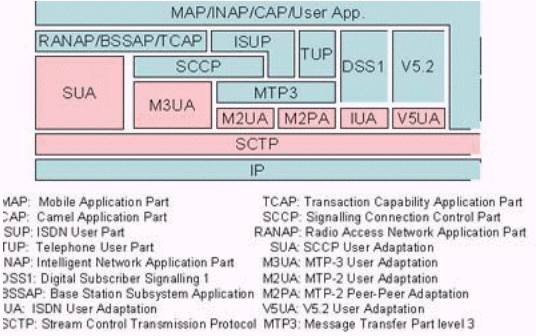 圖中粉紅色部分為SIGTRAN的協(xié)議棧,在它們之上的是對應(yīng)的電話信令協(xié)議。SIGTRAN的協(xié)議棧分為2層:一層是SCTP,它提供多個(gè)流的,可靠的數(shù)據(jù)傳輸,用戶數(shù)據(jù)的捆綁和分段,阻塞和流量控制,防止"拒絕服務(wù)"和"偽裝"的攻擊等功能。另一層是用戶適配層,圖中由SUA、M3UA、M2UA、M2PA、IUA和V5UA五個(gè)適配模塊所組成,它們分別來滿足各種電話信令協(xié)議適配的要求。